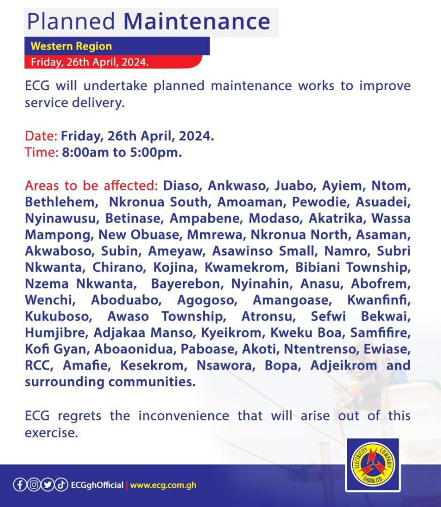 Planned maintenance : The Electricity company of Ghana (ECG) will undertake planned maintenance works to improve service delivery